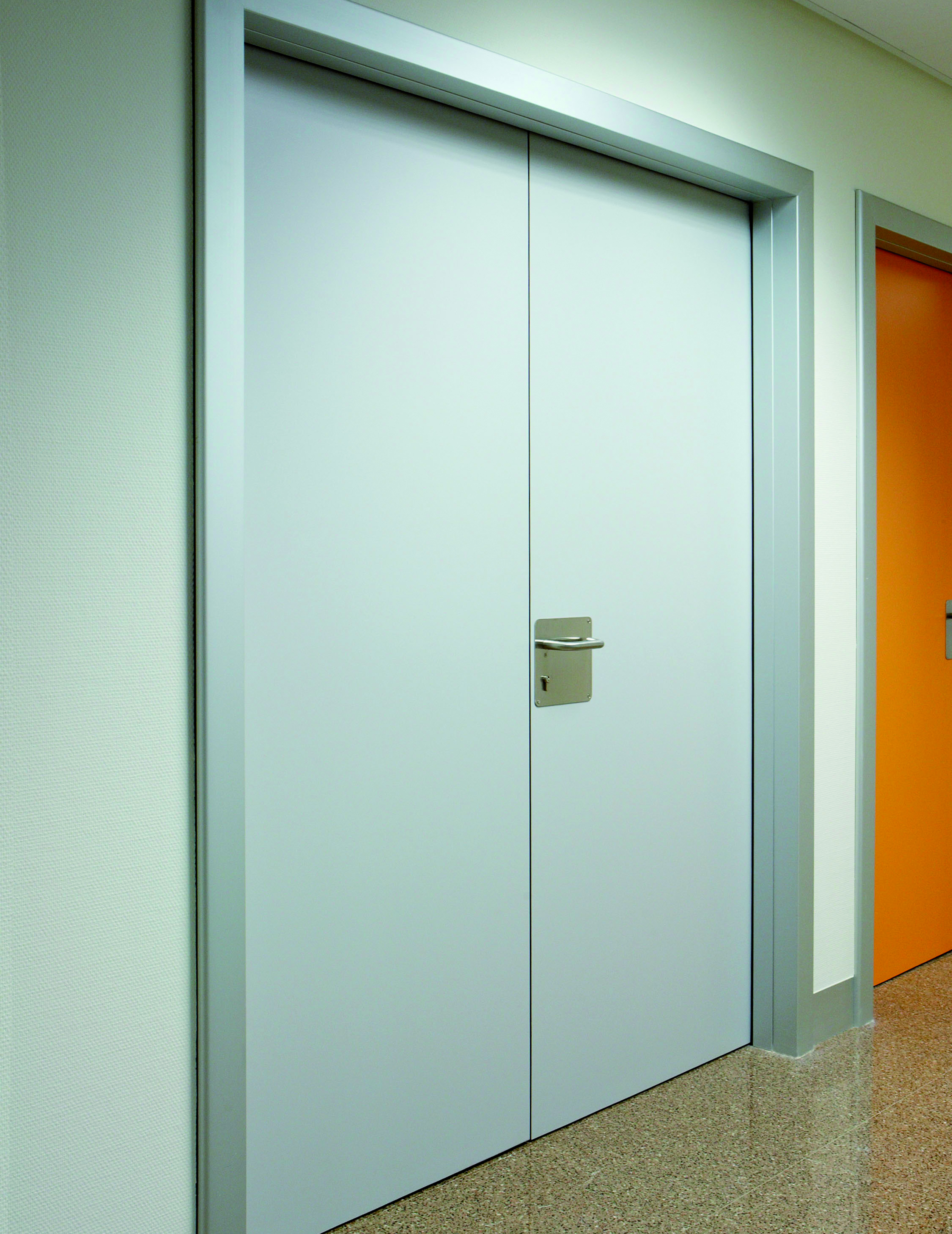 Hygienic Stainless steel & anti-bacterial coatings are available. The architrave forms part of the frame so there are no additional parts creating hard to clean joins.