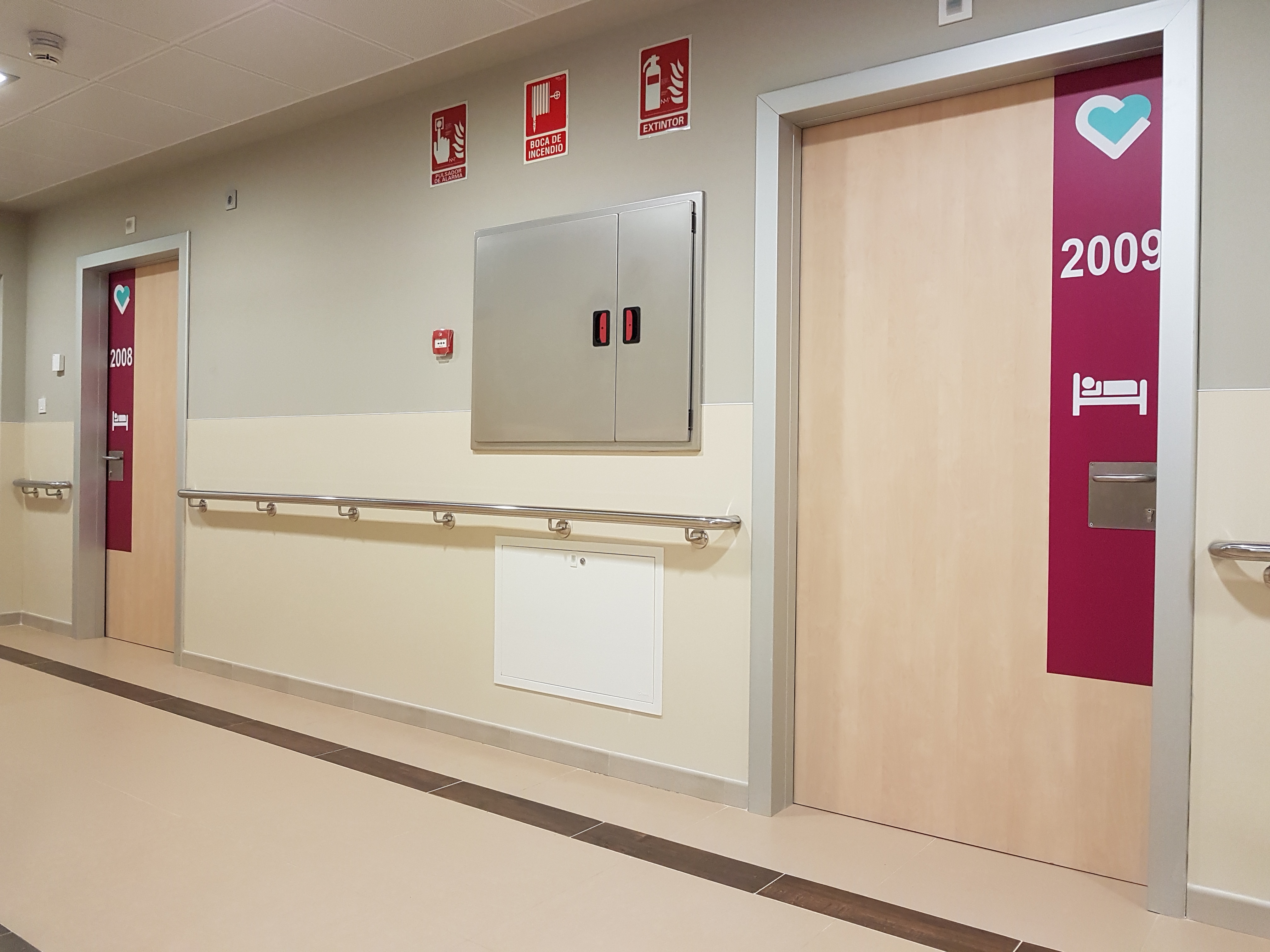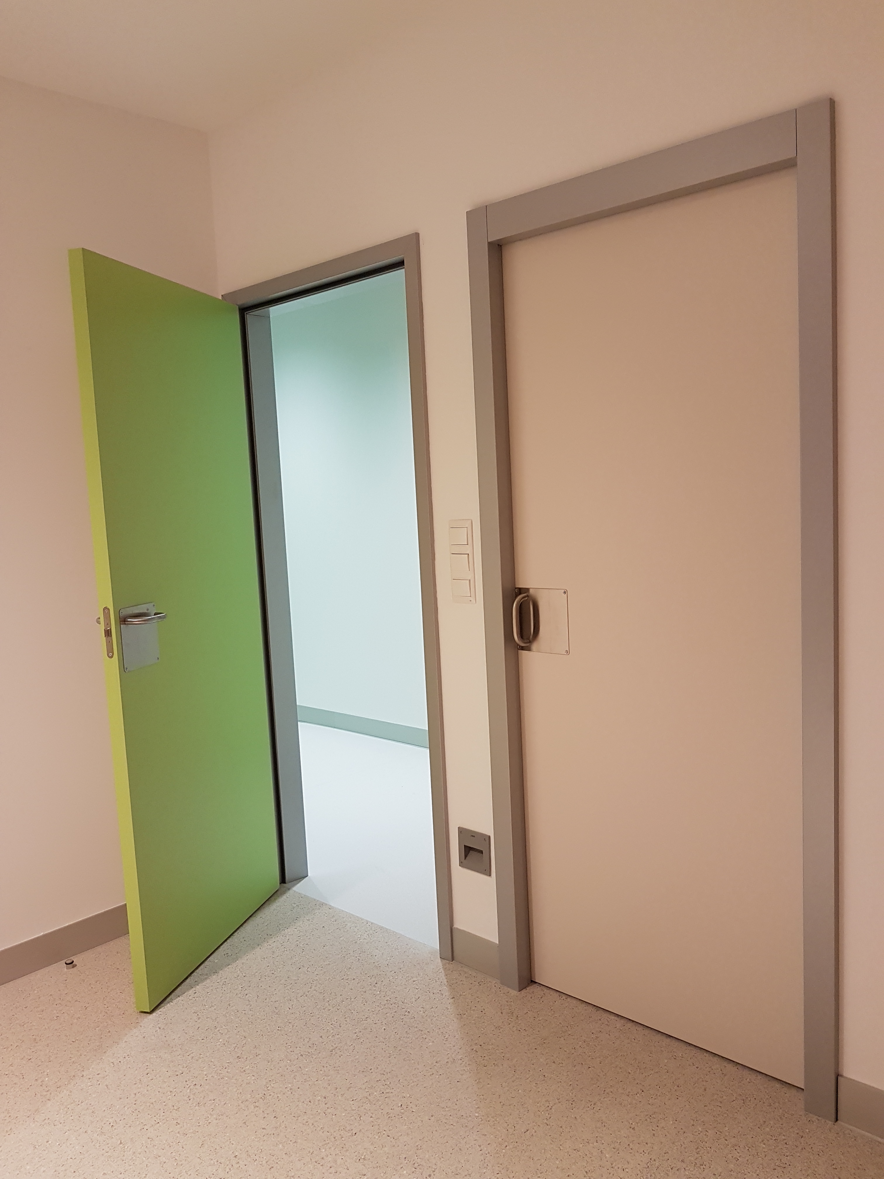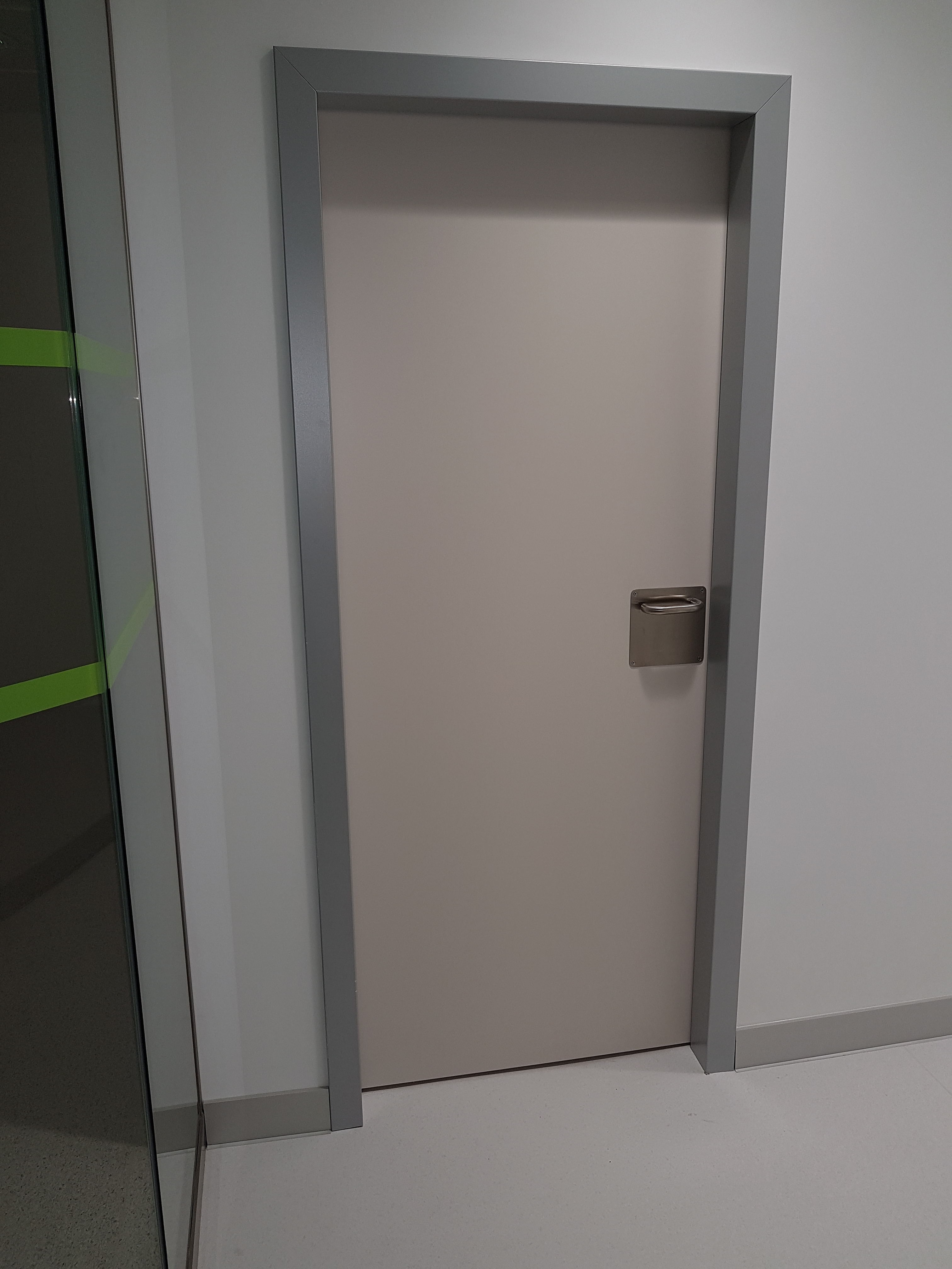 Hygienic Stainless steel & anti-bacterial coatings are available. The architrave forms part of the frame so there are no additional parts creating hard to clean joins.